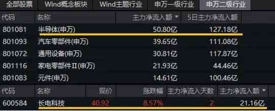 资金面上,截至发稿,半导体板块获主力资金净流入50.80亿元,近5日吸金127.18亿元,持续高居所有申万二级行业首位。值得一提的是,电子50指数成份股长电科技当前获主力资金净流入21.16亿元,霸居A股“吸金榜”榜首!