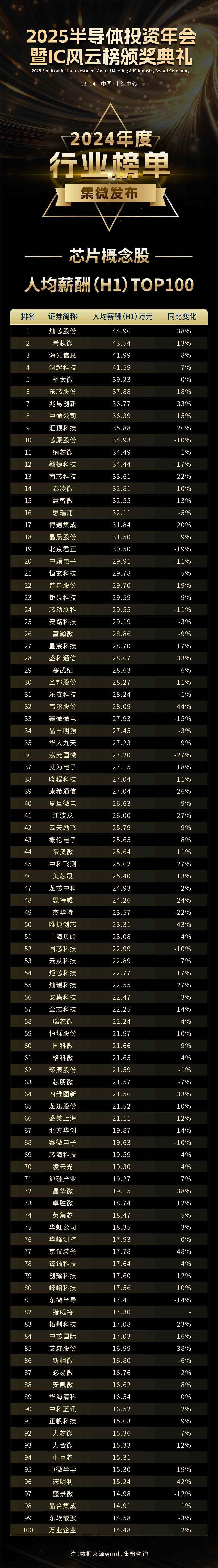中国芯“芯片概念股”人均薪酬(H1)TOP100出炉:灿芯股份排第一