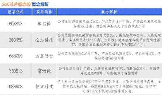 SoC芯片概念股全志科技也表示,公司芯片产品已经广泛应用在扫地机器人、四足机器狗等产品上。公司会密切关注相关市场需求和技术的发展。此外,SoC芯片在AI眼镜、智能驾驶等前端领域,也有大规模应用的潜力。这里,笔者为大家整理了部分SoC芯片概念股及其概念简析,谨供投资者参考。