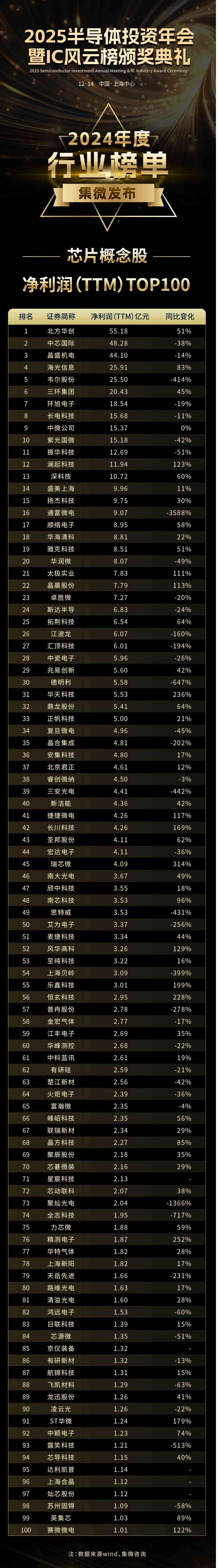 中国芯“芯片概念股”净利润(TTM)TOP100:北方华创高居榜首
