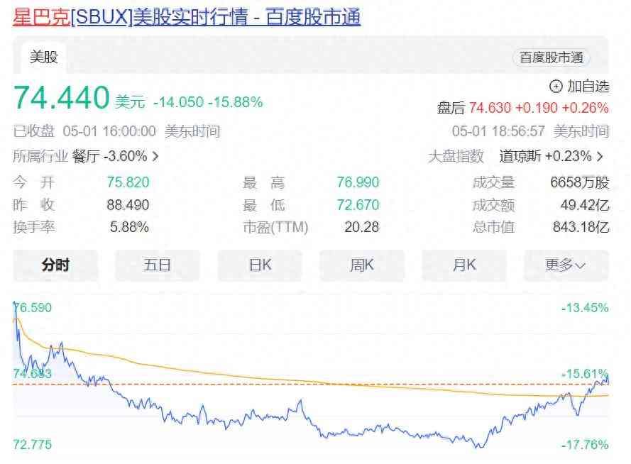当地时间5月1日,星巴克股价闪崩,一度跌近18%!截至收盘,星巴克跌15.88%,股价报收74.44美元,总市值843.18亿美元,市值一夜蒸发了159.15亿美元(约合人民币1150亿元)。