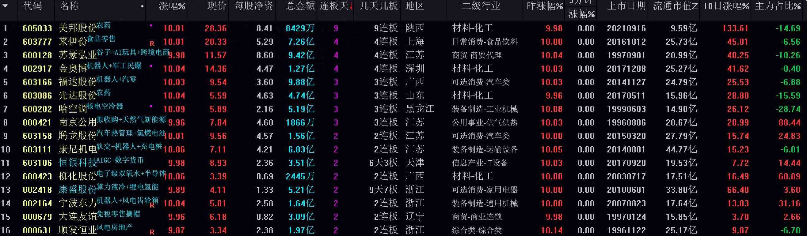 1 美邦股份605033 【九连板】农药+西部大开发+小流通盘