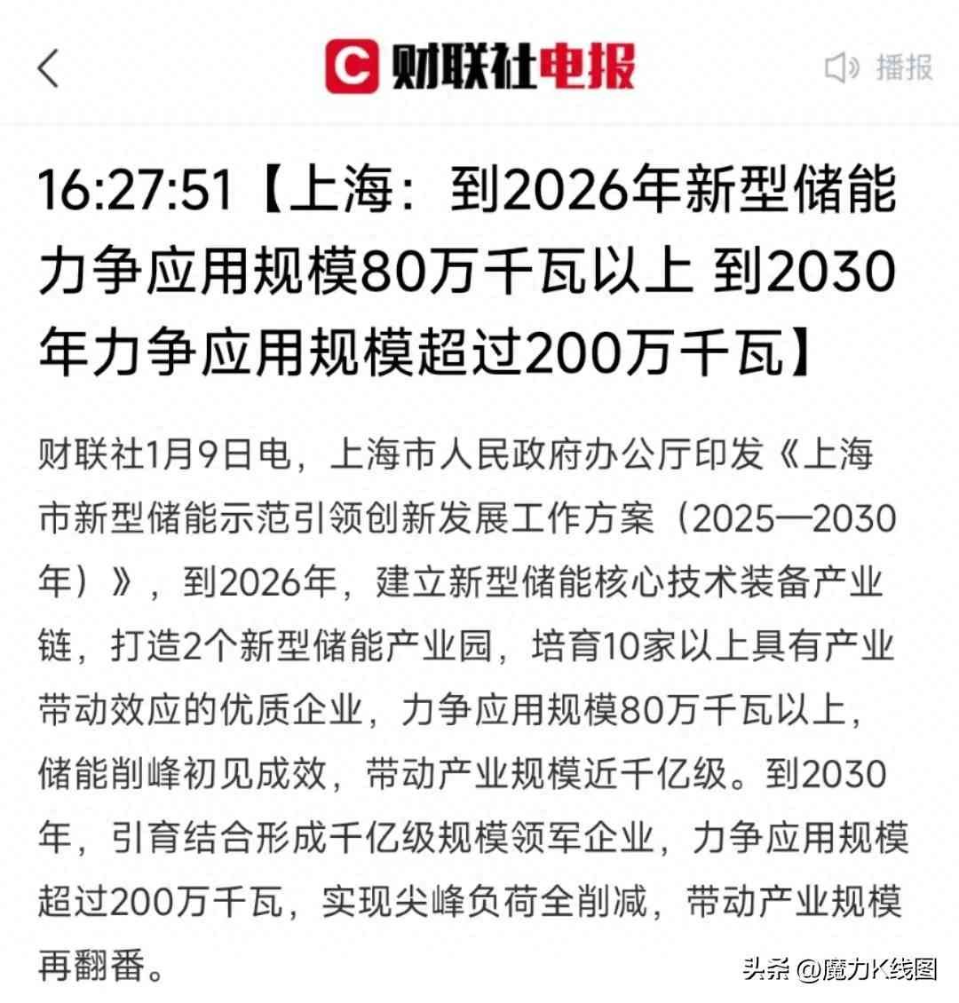 今天收盘后,上海又发布重磅利好,支持储能、充电桩、氢能源的发展。据财联社点,1月9日,上海印发了《上海市新型储能示范引领创新发展工作方案(2025—2030 年)》,为上海新型储能的发展勾勒出了一幅宏伟蓝图,也为整个能源行业带来了新的机遇与挑战。