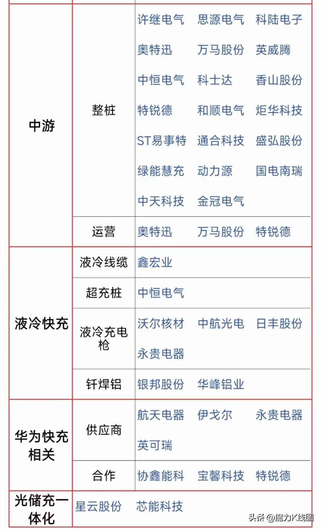 充电桩概念相关的,主要是从充电桩业务的上游、中游以及不同充电技术来进行梳理。充电桩主要是看企业在新技术突破方向,比如液冷超充、和华为合作相关等等。
