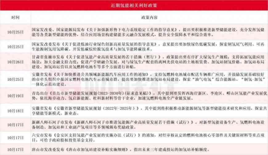 国家层面近期出台氢能指导意见,国内多地出台氢能利好政策,氢能发展纵向延伸,补贴规模扩大。据财联社不完全梳理,近期氢能相关利好政策汇总如下图: