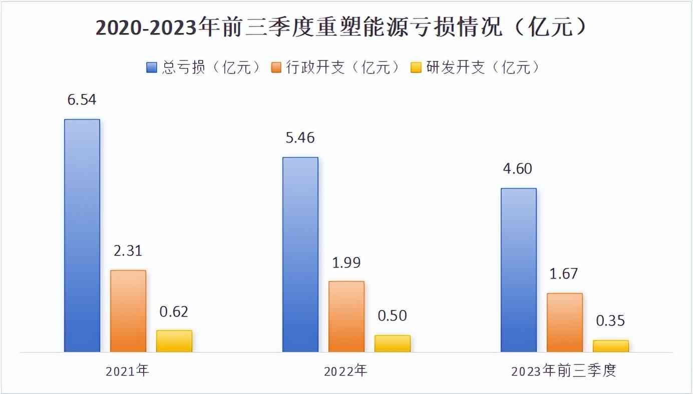 重塑能源2021至2023年前三季度亏损分别为6.54亿、5.46亿、4.60亿。其中行政开支分别为2.18亿、2.43亿、2.24亿,研发开支分别为2.31亿、1.99亿、1.67亿。
