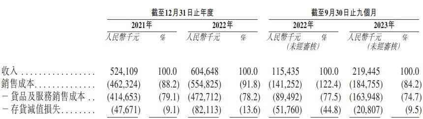 2021年至2023年前三季度重塑能源的销售成本分别为4.62亿元、5.55亿元和1.85亿元,占收入的比例分别为88.2%、91.8%和84.2%。同时,原材料成本在这些销售成本中所占的比例分别为87.0%、83.2%和88.5%。