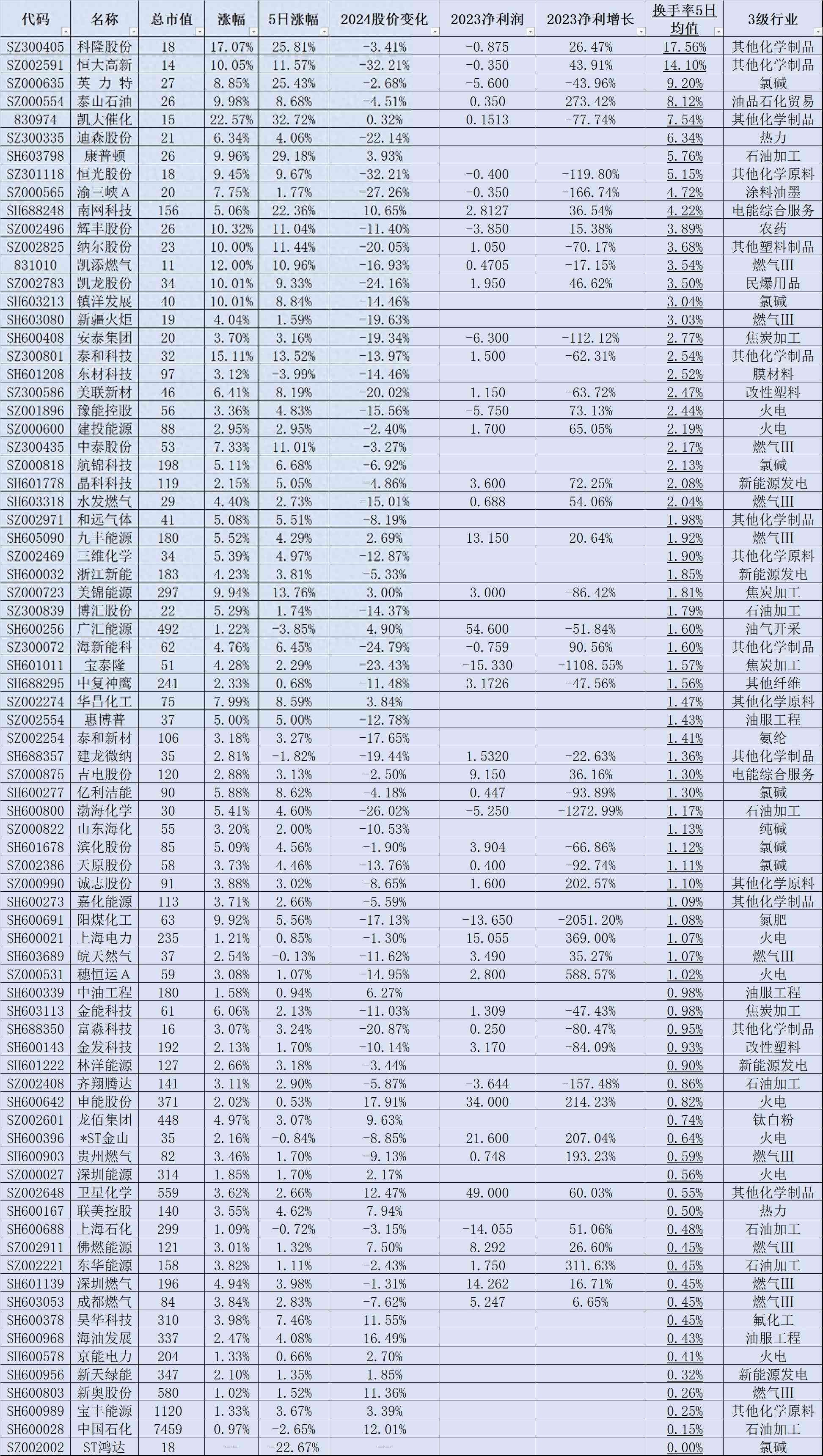 第二、16股近五日市场交易相对活跃即换手率均值超3%,分别是科隆股份、恒大高新、英 力 特、泰山石油、凯大催化、迪森股份、康普顿、恒光股份、渝三峡A、南网科技、辉丰股份、纳尔股份、凯添燃气、凯龙股份、镇洋发展、新疆火炬