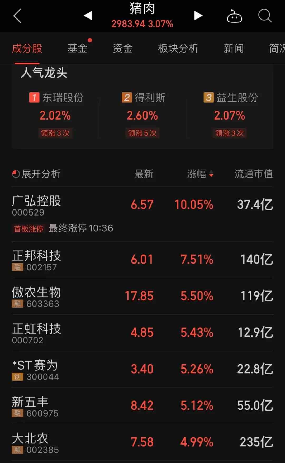 今天猪肉概念大涨逾3%,广弘控股涨停。