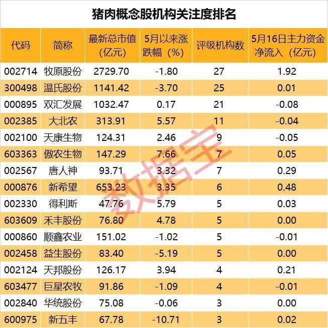 牧原股份也是猪肉概念股中机构关注度最高的个股,合计有27家机构评级。此外,温氏股份、双汇发展、大北农等个股均有10家以上机构评级,天康生物、傲农生物、唐人神等个股均有5家以上机构评级。