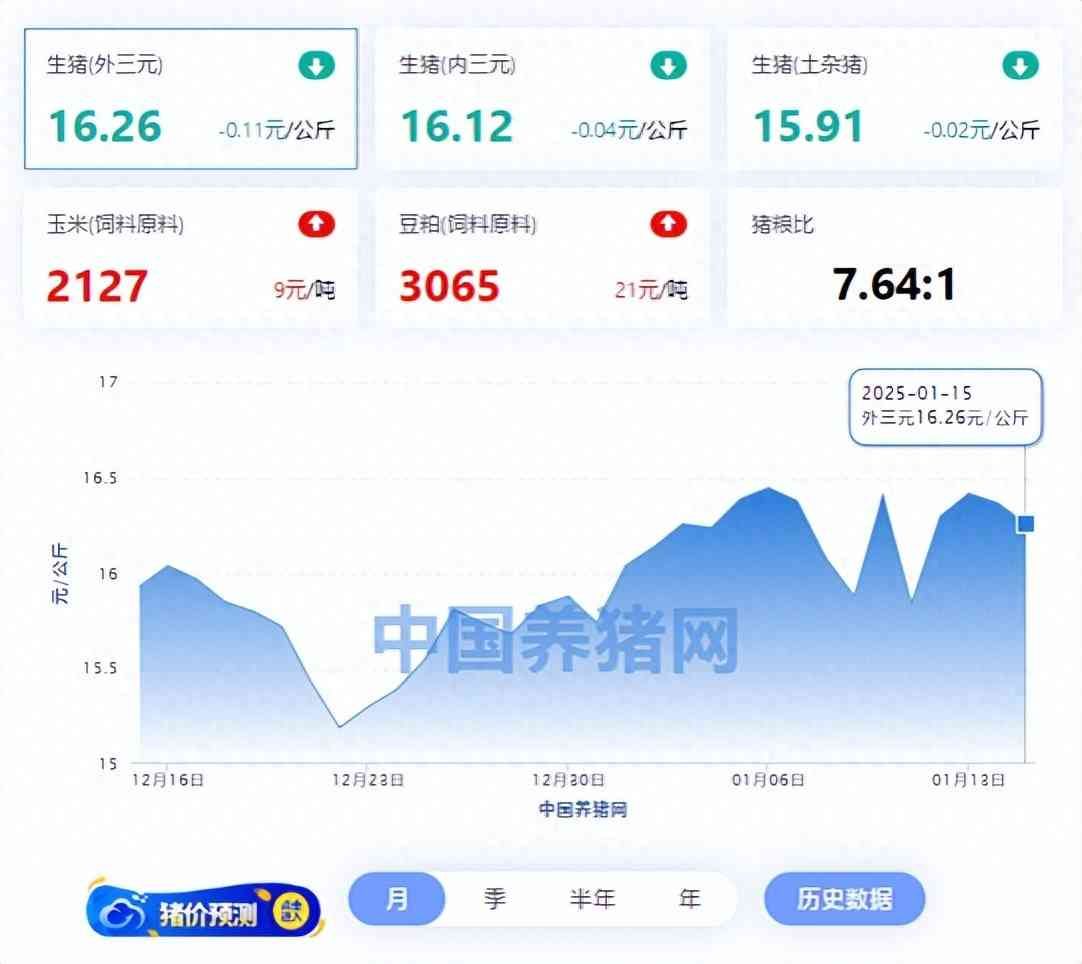 据中国养猪网统计,01月15日,全国外三元生猪价格均价为16.26元/公斤,较昨日下跌了0.11元/公斤。全国猪价最高为宁夏回族自治区19.48元/公斤,最低为云南省14.97元/公斤。整体看来,今日外三元生猪价格走势为6涨3平22跌。