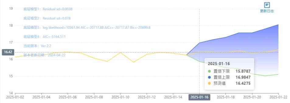 玄田算法是由项目课题组团队原创的非经典逻辑数值聚合理论和不确定性预测方法,构建了基于一致模算子的生猪价格预测模型。该模型采用的聚合函数及一致模相关理论与方法已获得多项国家自然科学基金和省级自然科学资金资助,并获得多项省级自然科学奖奖项。01月16日预测猪价为16.4275,置信区间在15.8787--16.9847之间。01月17日预测猪价为16.4324;01月18日预测猪价为16.4057。