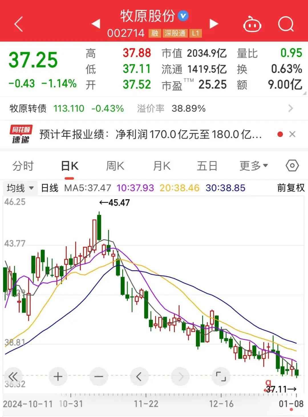 1月8日晚间,牧原股份发布2024年度业绩预告,预计实现归母净利润170亿元—180亿元,同比扭亏为盈。按预计归母净利润下限计算,2024年牧原股份净利润有望创下上市以来第二高,仅低于2020年。