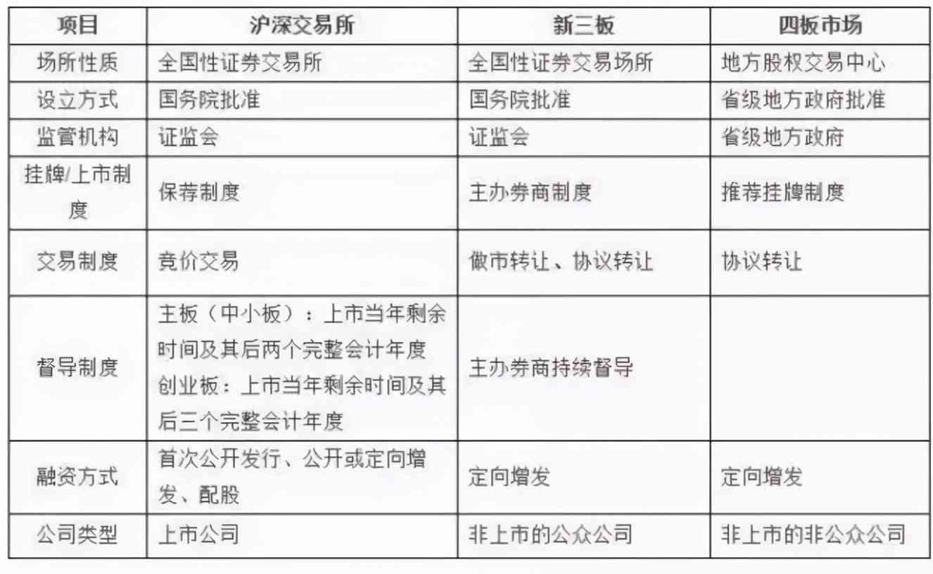 我国多层次资本市场目前主要由交易所市场(上海证券交易所、深圳证券交易所)、新三板(全国中小企业股份转让系统)、四板市场(区域股权交易中心)等构成,每个市场都各自扮演着其重要角色。现有的多层次资本市场已经能够基本满足不同类型的企业在不同发展阶段的融资需求。沪深交易所作为场内交易市场,与新三板市场和四板市场具有显著区别,其主要区别如下(2019年):