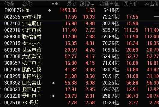 PCB板块今日表现强势,指数大涨4.54%,在A股所有概念板块中涨幅居前。沪电股份、安洁科技收获涨停板,深南电路、崇达技术、世运电路等股涨幅居前。