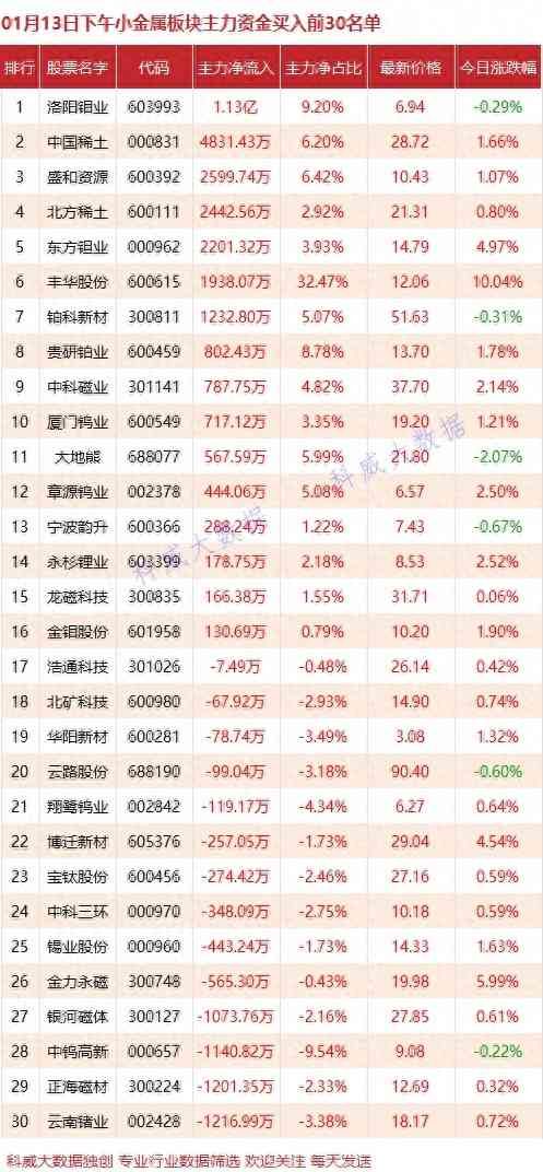 稀土矿股票一览表最新,小金属板块主力资金买入前30名