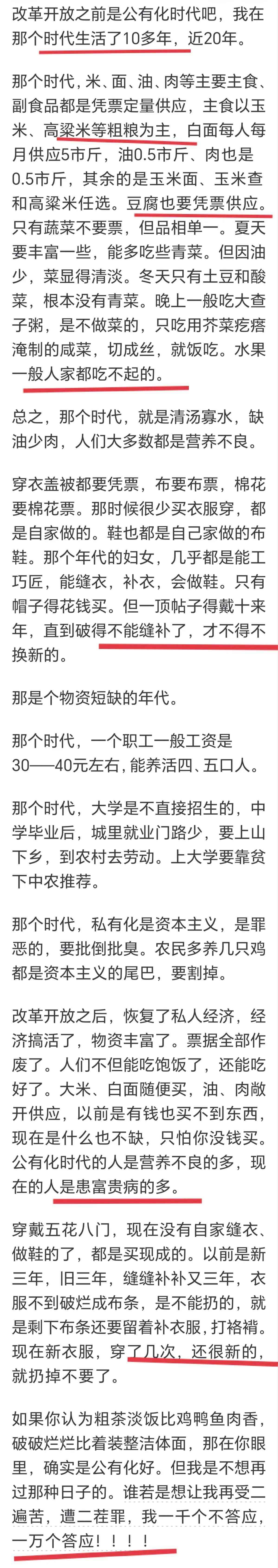 粗茶淡饭,是当时物资紧缺造成的,而不是公有制的问题。物资紧缺,不是公有制给了你最基本的保障,你可能连饭都吃不起。囤积居奇,哄抬物价,那是可是私有制的传统技能。而且凡是涉及到国计民生,国防金融领域,比如医疗教育,你敢开全面私有制,就打开了人类欲望的潘多拉魔盒