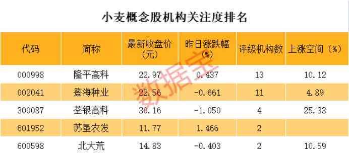 整体上看,A股市场主营与小麦相关的个股,总共有10只。其中,隆平高科、登海种业、荃银高科等个股均有3家以上机构评级,苏垦农发、北大荒两只个股有两家机构评级。