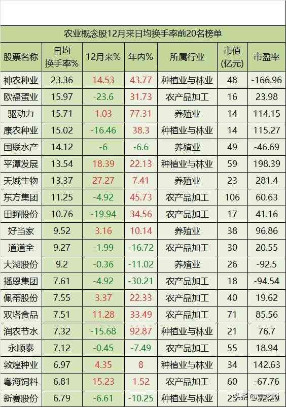农产品龙头股排名一览,20家12月来高换手率农业股名单出炉