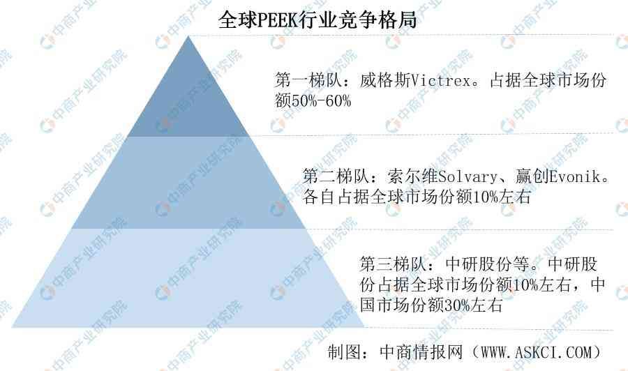 当前全球PEEK生产厂商呈现“一超多强”的竞争格局。第一梯队威格斯Victrex占据全球市场份额50%-60%之间,第二梯队的索尔维Solvary和赢创Evonik各自占据全球市场份额10%左右,第三梯队的中研股份占据全球市场份额10%左右,但略低于索尔维Solvary和赢创Evonik,在中国市场方面,占据市场份额30%左右。