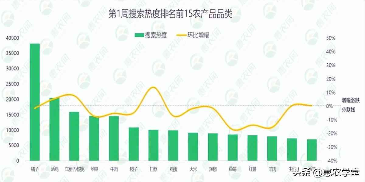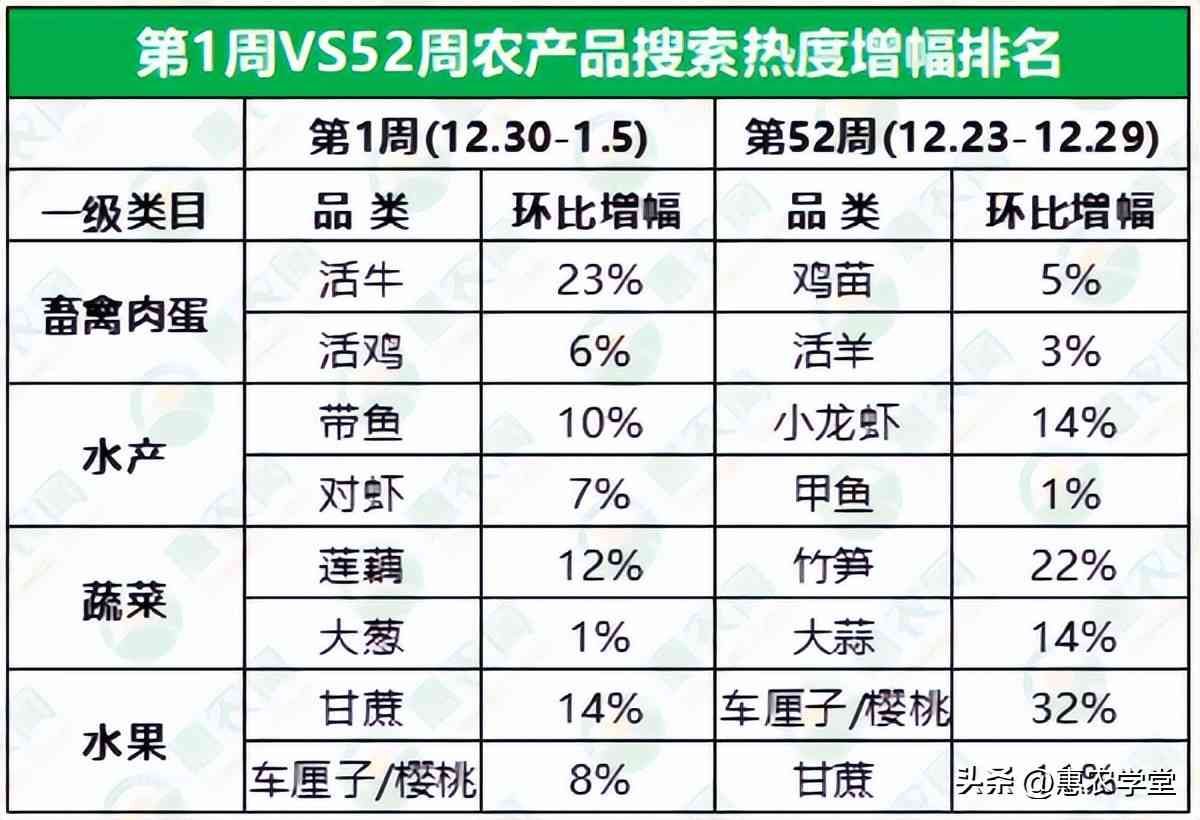 市场热门搜索品类的热度增幅方面,第1周,活牛以23%的增幅成为热度增长最快的品类,甘蔗和莲藕依次随后,热度增幅分别为14%和12%。