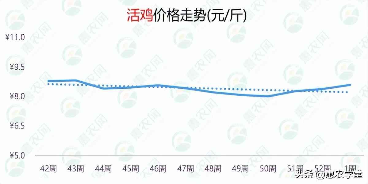 12月中下旬,活鸡价格在达到近三个月8.0元/斤的低谷后,开始反弹回升,此后几周,活鸡价格持续上涨。第1周,活鸡价格为8.6元/斤,环比上涨2%,已连续3周上涨。