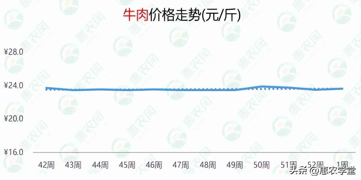 近期,牛肉市场价格以稳为主,并伴有小幅上涨的态势。第1周,牛肉的价格为23.6元/斤,环比小幅上涨0.5%。