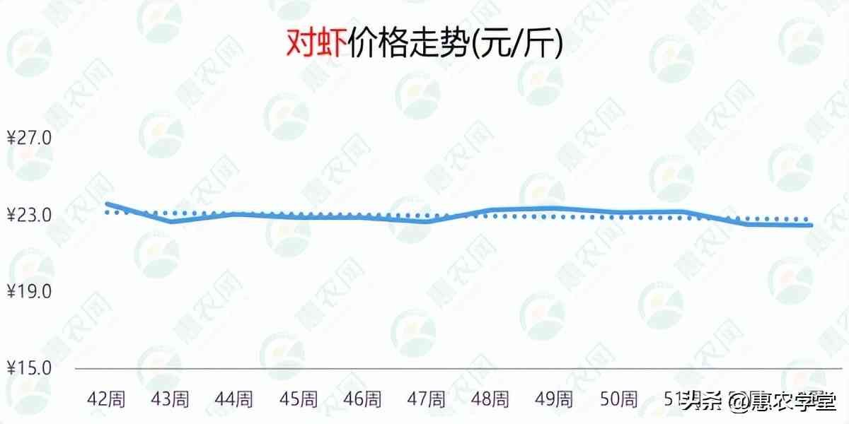 本周,对虾的供需无明显变化,行情趋于稳定,价格为22.5元/斤,与上周价格水平基本保持一致。