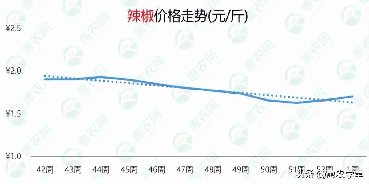 冬季气温低,辣椒种植、采摘和运输成本较前期均有所上涨,行情随之上行。第1周,辣椒价格为1.7元/斤,环比上涨2%。