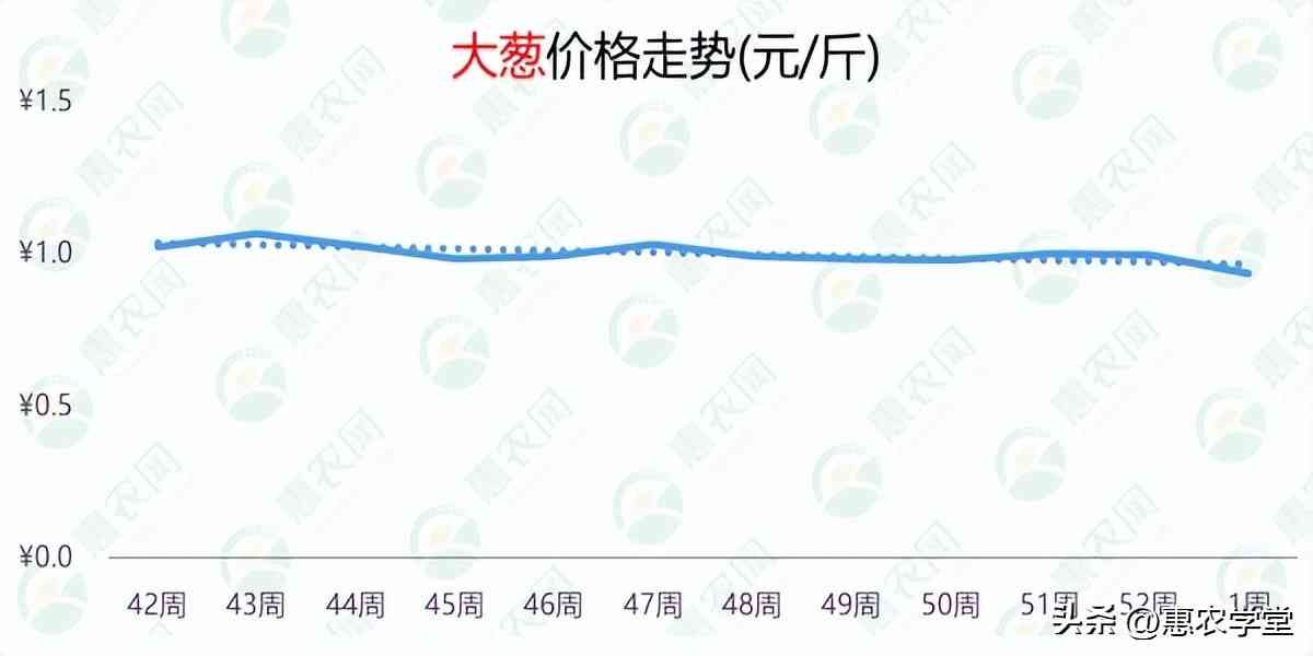 从近三个月的行情走势来看,大葱的价格有涨有跌,但整体为下降态势。第1周,大葱价格为0.9元/斤,较上周下跌6%,较第42周下跌8%。
