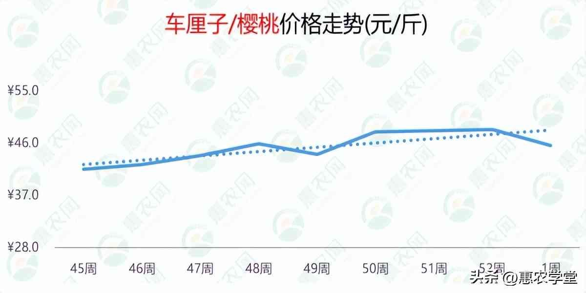 第1周,车厘子/樱桃价格为45.6元/斤,环比下跌6%。车厘子/樱桃价格下降的主要原因是今年智利的天气状况良好,车厘子/樱桃的产量达到较高水平,到货量不断增加,促使价格出现下滑。