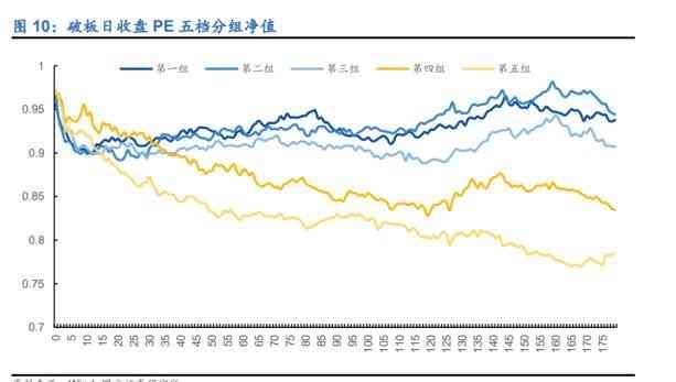 在所有回测区间内符合条件的次新股,以破板交易日的收盘PE为指标,将2019年7月以来的次新股破板PE 由低到高分成五组,统计五组净值的分化情况。五组净值分化明显,PE最高的一组在破板日后便不断下跌,最终平均净值停留在0.78;PE 最低的两组走势相似,最后净值停留在0.94附近。测试结果说明,PE指标对次新股的表现有很强的区分度,高估值的次新股将均值回归,股价下跌。