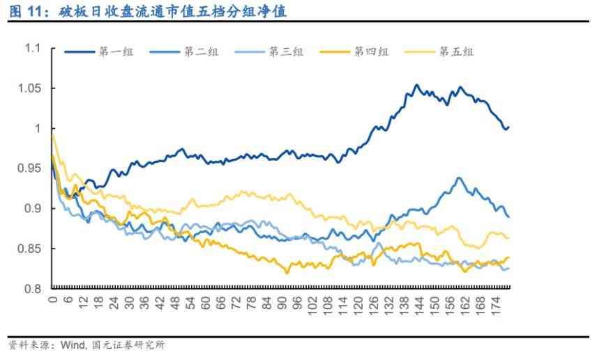 A股市场存在流通市值小更容易受到资金关注的现象,所需资金量少的背景下资金间分歧度下降,收益提升显著。我们将次新股破板日流通市值由低到高分成五组,统计五组净值的分化情况。流通市值小的股票分组能够显著获得超额收益,而其他分组的收益分化不是很显著,流通市值最小的一组最终净值停留在1,远高于其他分组的收益。