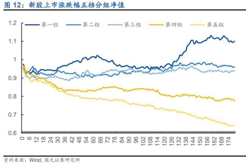 反转效应在A股市场普遍存在,新股上市涨幅越高,获利资金越多,次新股后市下跌的可能性就越大。将测试区间内所有次新股上市涨跌幅由低到高分成五组,统计五组净值的分化情况。五组区分度十分明显,新股上市涨跌幅幅越低,后市股价越强势,而新股上市涨幅最高的次新股,后市超额收益显著为负。此外,行业也有一定的影响。