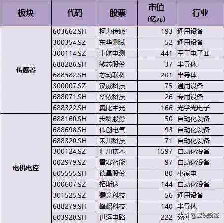 包含:柯力传感(提供高精度传感器,市值为193亿元)、东华测试(提供传感器)、中航电测(提供高精度传感器和测量系统,市值为441亿元)、敏芯股份(提供微机电系统(MEMS)传感器)、芯动联科(市值为201亿元)、汉威科技(提供多种传感器和检测设备)、华依科技、奥比中光。