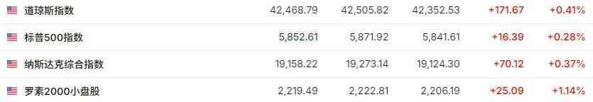 美股三大指数仅纳指跌。标普5指数收涨6.69点,涨幅0.11%,报5842.91点。与经济周期密切相关的道指收涨221.16点,涨幅0.52%,报42518.28点。科技股居多的纳指收跌43.71点,跌幅0.23%,报19044.39点。纳指1收跌0.13%。衡量纳指1科技业成份股表现的纳斯达克科技市值加权指数(NDXTMC)收跌0.24%。对经济周期更敏感的罗素2小盘股指数收涨1.13%。恐慌指数VIX收跌2.40%,报18.73。