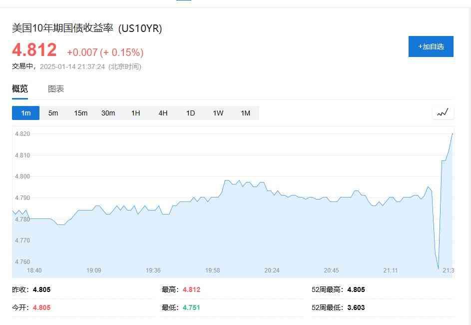 美股期货短线拉升后小幅走低,纳斯达克1指数期货涨幅收窄至0.6%。美国10年期国债收益率短线下挫后又急速拉升,现报4.812%。
