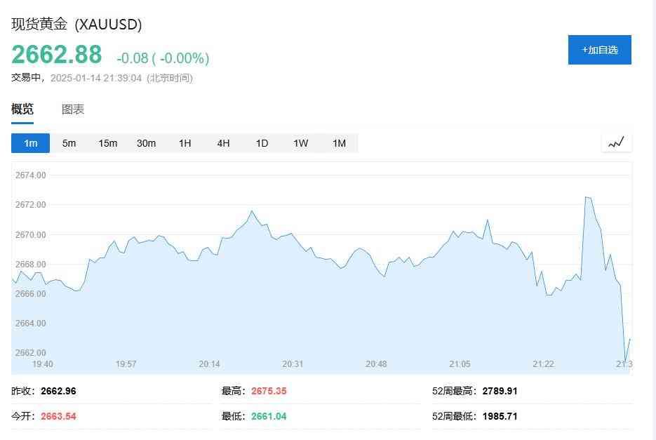 现货黄金短线拉升约5美元后又下跌约9美元,现报2662.88美元/盎司。