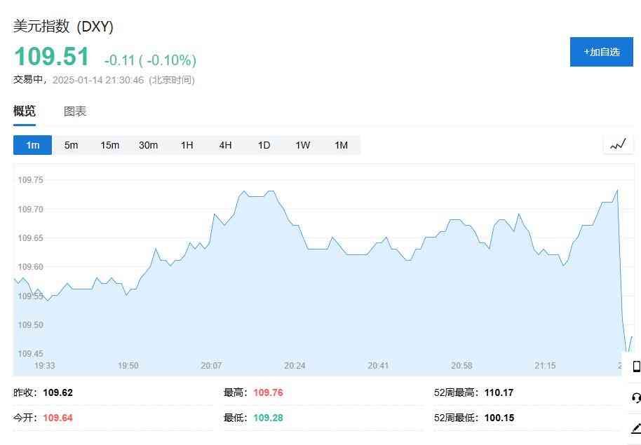 美国PPI数据公布后,美元指数短线下跌,美股期货短线拉升。美元指数短线下跌约20点,现报109.51。