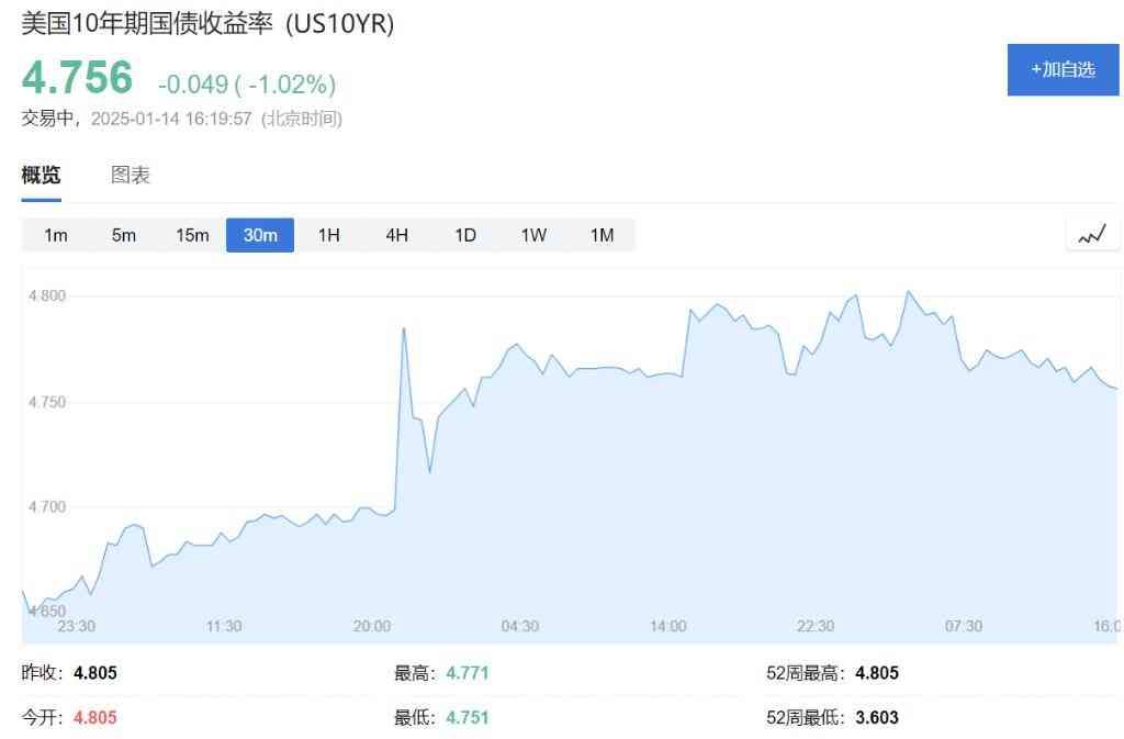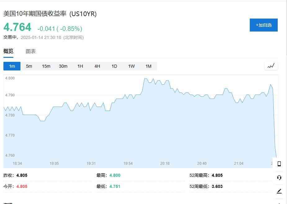 美国10年期国债收益率短线下挫,现报4.764%。现货黄金短线拉升约5美元,现报2672.98美元/盎司。
