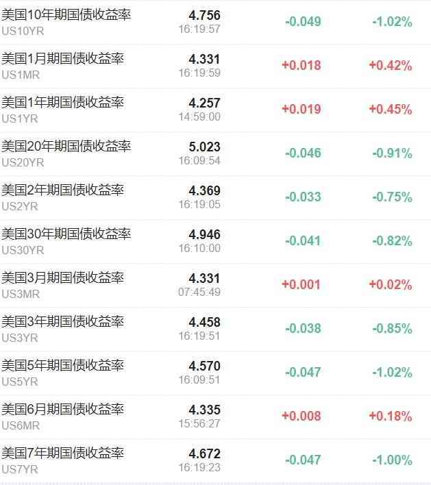 美债多数回暖,10年期美债收益率下行5个基点。