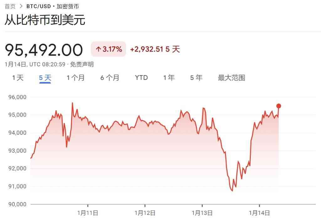 比特币涨超3%,现报95492美元/枚。