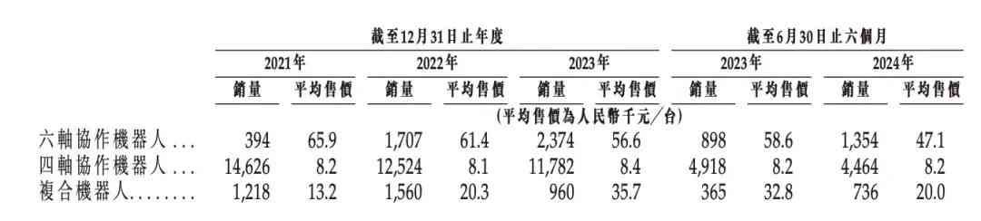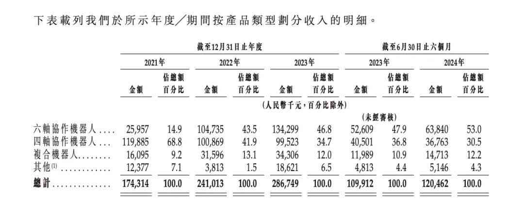 具体而言,2021年至2023年,越疆科技六轴协作机器人的收入分别为2595.7万元、1.05亿元、1.34亿元,占总收入的14.9%、43.5%、46.8%;四轴协作机器人的收入分别为1.2亿元、1.01亿元及9952.3万元,占总收入的68.8%、41.9%及34.7%。