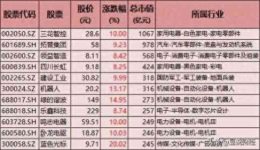 包含:三花智控(专注仿生机器人和智能控制器研发)、拓普集团(机器人执行器领域龙头,为特斯拉等客户提供组件)、领益智造(与Hanson Robotics合作推进人形机器人技术)、四川长虹(聚焦家庭服务机器人)、机器人、绿的谐波、乐鑫科技(提供机器人无线通讯芯片)、鸣志电器等。