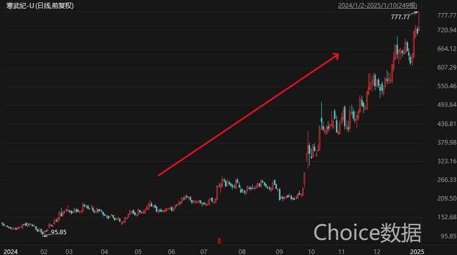 有科创板AI芯片第一股之称的寒武纪周五盘中一度大涨9%,最高触及777.77元,刷新历史新高。截至收盘,寒武纪涨2.48%,报729.97元/股,最新总市值为3047亿元。值得注意的是,2024年寒武纪累计涨超387%,剔除新股后,成为A股年度涨幅王。自2024年年初迄今,寒武纪股价累计最大涨幅711.44%。