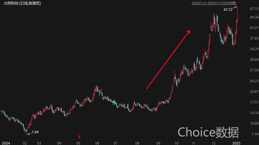 人形机器人概念股北特科技周五盘中一度大涨9%,最高触及47.72元。拉长时间来看,自2024年年初迄今,北特科技股价累计最大涨幅541.40%。消息面上,近日,人形机器人产业迎来密集催化。马斯克表示,如果一切进展顺利,2026年特斯拉的人形机器人产量将增加10倍。此前,黄仁勋在CES2025上再次强调人形机器人的GPT时刻到来。