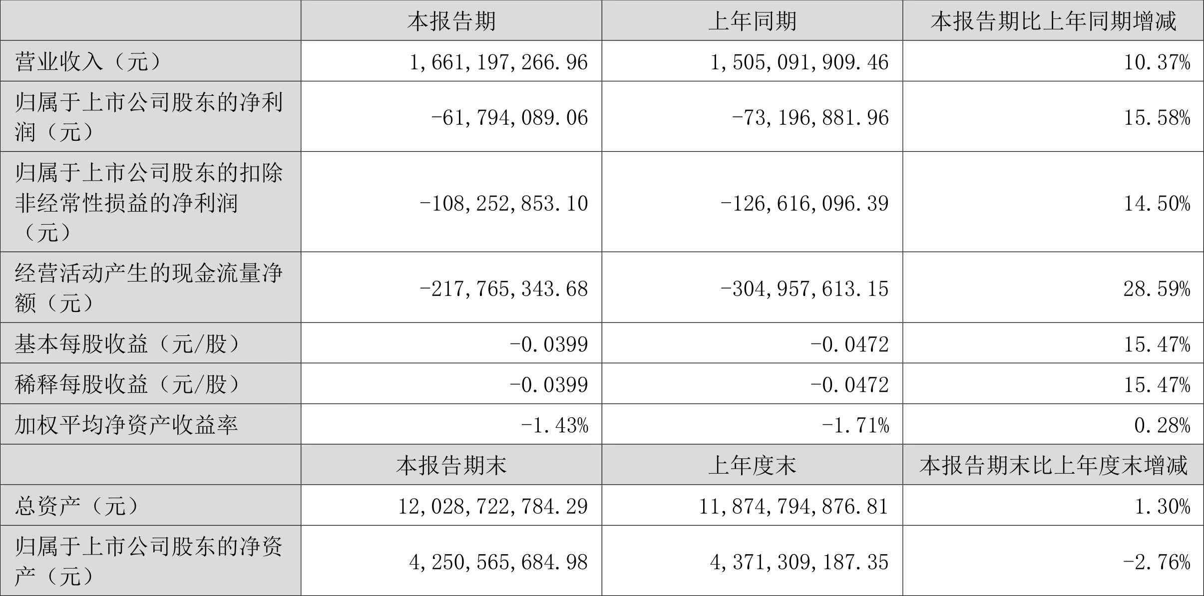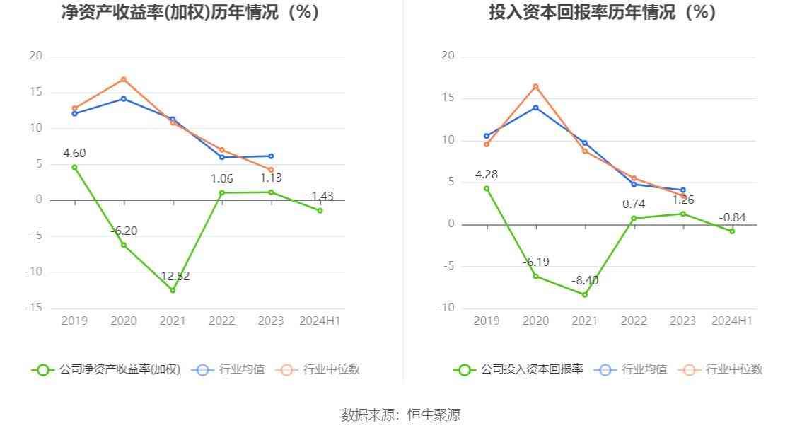 数据显示,2024年上半年公司加权平均净资产收益率为-1.43%,较上年同期增长0.28个百分点;公司2024年上半年投入资本回报率为-0.84%,较上年同期增长0.10个百分点。