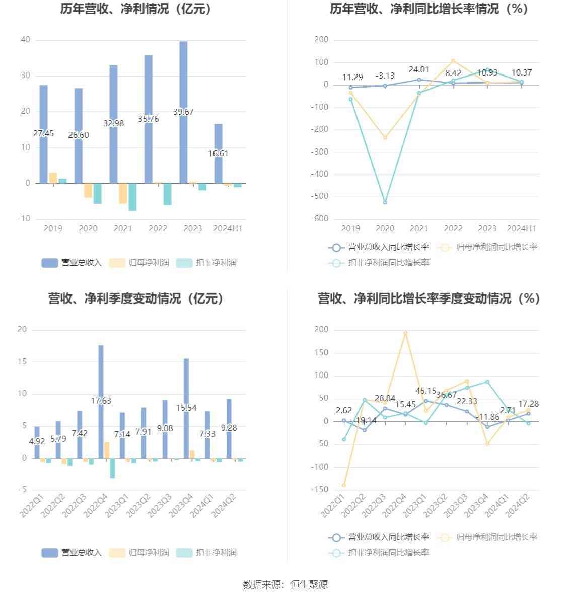 根据半年报,公司第二季度实现营业总收入9.28亿元,同比增长17.28%,环比增长26.53%;归母净利润-2142.28万元,同比增长25.37%,环比增长46.94%;扣非净利润-5020.85万元,同比下降4.22%,环比增长13.50%。