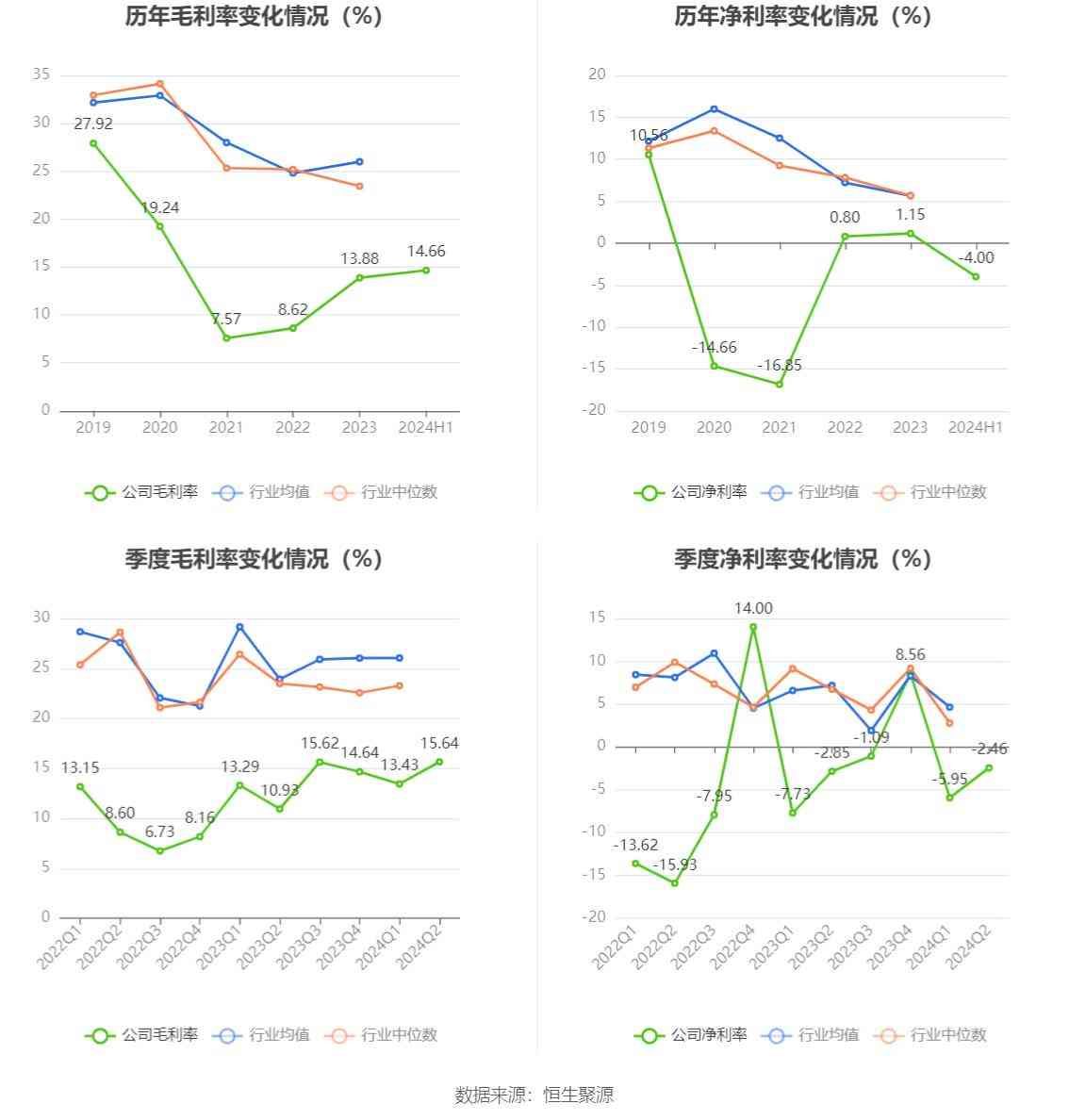 2024年上半年,公司毛利率为14.66%,同比上升2.61个百分点;净利率为-4.%,较上年同期上升1.16个百分点。从单季度指标来看,2024年第二季度公司毛利率为15.64%,同比上升4.71个百分点,环比上升2.21个百分点;净利率为-2.46%,较上年同期上升0.39个百分点,较上一季度上升3.49个百分点。