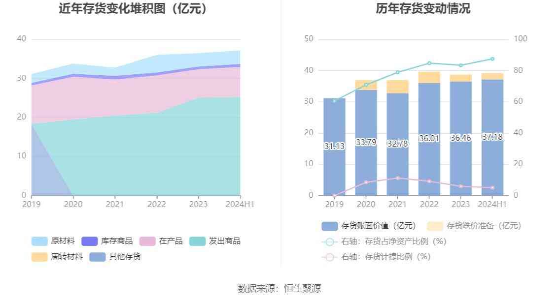 从存货变动来看,截至2024年上半年末,公司存货账面价值为37.18亿元,占净资产的87.47%,较上年末增加7156.23万元。其中,存货跌价准备为1.99亿元,计提比例为5.08%。